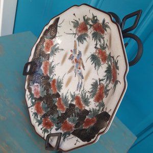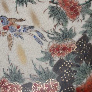 Toyo Plate Porcelain Dish Bird Peacock Pheasant Gold Leaf Hand Painted Japan Collectible Vintage plate with crazing. Bird Platter collectible japanese porcelain art gold leaf trim accents painted porcelain plate with bird or peacock or pheasant on front with flowers having gold details.ceramic plate porcelain platter Made in japan with toyo signature mark on bottom. Toyo