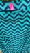 It is navy blue and teal green in color, zigzag print, curve neckline, cold shoulder, gathers at the waist and is short sleeve.