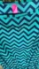 It is navy blue and teal green in color, zigzag print, curve neckline, cold shoulder, gathers at the waist and is short sleeve.
