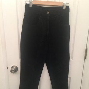 Classic vintage black suede jeans made by Hammerschmid of Germany. These high top jeans are in very good to excellent vintage condition (30 years old). They are lined and the only wear is at the pocket edge and where the belt inserts where the suede is a bit shiny as shown in photos. Some photos appear grey, but the jeans are black. The zipper is metal and the jeans are tapered. The inseam is 28 inches and the waist to crotch measurement is 13 inches. 36 European size 4 American