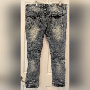 Track 23 Men’s 40x32 Skinny Stretch Acid Wash Ripped Moto Distressed Blue Jeans. Stylish distressed blue jeans with a unique washed pattern. Perfect for casual wear.Great condition