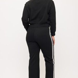 This sleek black tracksuit with bold white stripes is your go-to for effortless edge and everyday comfort. Made with a soft, stretchy blend of 95% polyester and 5% spandex, it hugs in all the right places while letting you move freely.