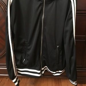 Very thick material. Good quality. Has a nice fit. Two stripes going down the arms. No holes. No loose threads.