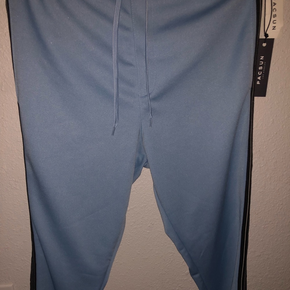 Pacsun light blue track pants with black stripes down the side, never worn.