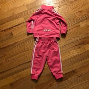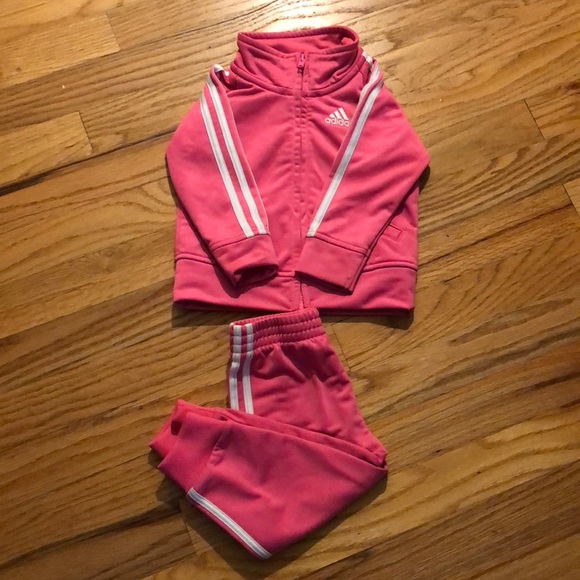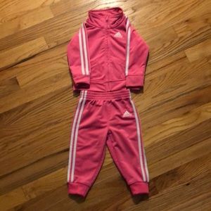 Pink adidas track suit with white stripes.