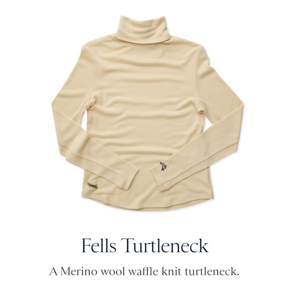 The Tracksmith Fells Turtleneck size “XS” in color “Dune” is a Merino wool waffle-knit long-sleeve top for running in cold weather, featuring temperature-regulating, moisture-wicking, and odor-resistant properties, plus thumbholes and a double-layered collar for added protection and warmth. It offers a soft, lightweight feel and is designed with a classic silhouette for athletic and casual wear, although some users recommend sizing down for a more snug fit.