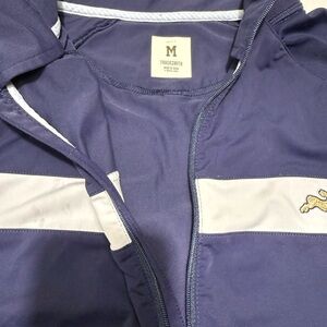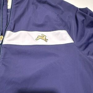 Navy performance jacket with white stripe. Features a half-zip design. Embroidered logo on chest.