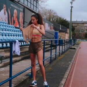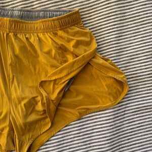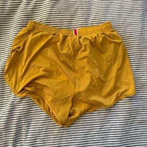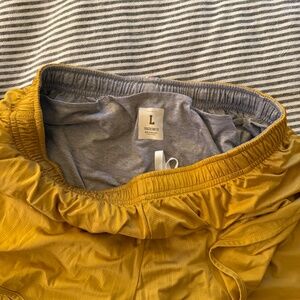 Mustard/golden color. Size L. Multiple internal pockets. Drawstring waistband. 3" inseam. Barely worn!