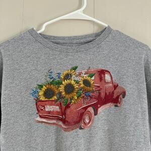 Tractor Supply gray long sleeve t shirt! cutie tractor with flowers / sunflowers in the bed of the truck! unisex large