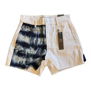 Utility meets boho in these carpenter style cutoffs with a tie-dyed front panel and contrasting hammer loop.