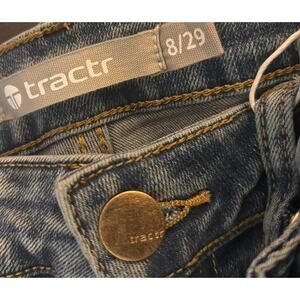 Tractr High Rise Skinny Jeans, Distressed Raw Hem, Medium Wash, Size 8/29, NWT. Trendy and versatile pair of jeans featuring a high rise fit, skinny leg design with stretch for comfort, distressed details at the front for a modern edge, raw cut frayed hems with step hem style finish, classic 5 pocket styling with button and zip fly. New with tags, retails for $90.