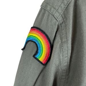 NWT. Army green long sleeve collared snap up shirt with colorful patch detail. Cuffs snap. Rayon/cotton material. Approx. measurements: Shoulder to hem 22", pit to pit 17", sleeve from neck to sleeve hem 27". Girl's Size M (10/12).