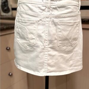 Stylish white stretchy denim skirt with distressed details. Ideal for casual wear. Versatile and trendy.