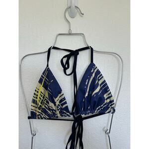 This bikini is perfect for your holiday. It comes in a bold blue and yellow color combination. It is a classic tie top triangle bikini with adjustable side and neck ties. I believe it could be a reversible set and the inside is all white with the exception of a stripe on the bottoms. The bottoms are a cheeky hipster style bottom, it is a high waisted cut with a lower cut front, ultra cheeky cut. It is a sample sale piece so it does not have a material tag. New without tags.