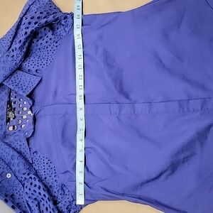 Tracy M, Eyelet Accent Fitted Button Down Blouse, Purplish Blue Color, NWT. Gorgeous Purplish Blue Colored, Fitted Top with Eyelet Accents All Over the Top! That is exactly what this shirt is.....Over the Top! The only flaw I can find is a tiny portion of the stitching is loose on the hem. Shown in last photo.