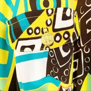 Tracy Negoshian Womens Bright Geometric Print Elastic Waist Button Front Dress S. Excellent Pre-owned condition. Gentle signs of wear. No stains or holes. Buttons on front and on front pockets. Also has slit pockets on sides. Smocked elastic waist band.