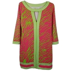 Tracy Negoshian Dress Keyhole Neckline Preppy Loose Retro Neon Print Cap Pocket