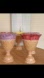 Delightful Tracy Porter Waffle Cone Ice Cream Sundae Dishes, Set of 5 Bowls from the Alouette Collection is a set of contemporary-style ceramic dishes designed in an abstract shape, perfect for serving ice cream. Made in China in the 2000s, these glossy finished bowls feature a vibrant color scheme of yellow, purple, red, and blue. With a unique waffle cone design and a large opening, these dishes add a fun and stylish touch to any ice cream-themed event or dining experience. *Pictures of a couple tiny chips shown.