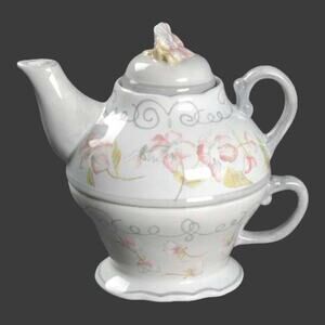 Tracy Porter Georgette TEA FOR ONE Ceramic Cup + Teapot & Lid Pink Gray with Tag!