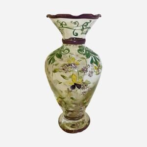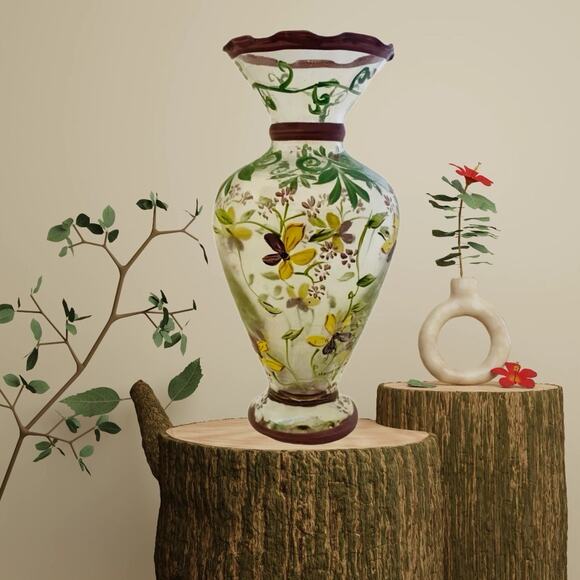 Add artistic charm to your space with this vintage Tracy Porter hand-painted bud vase. Standing at 6.5” tall, this glass vase features delicate purple and yellow floral motifs with a romantic ruffled rim. Tracy Porter’s signature bohemian elegance shines through in this vibrant, collectible piece—perfect for displaying a single bloom or as a decorative accent on its own.
