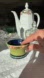 Pair of Tracy Porter desert bowls from The Stonehouse Farm Collection. Dishwasher, Microwave and Oven Safe. Green with raised, painted fruits and vegetables along top and navy bottom scalloped trim. 3 1/2” diameter at top.