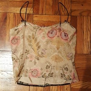 Beautiful Tracy Reese 100% silk, multi-pastel (shades of beige/taupe and pink silk) colored camisole with black lace overlay in size 4. Fully lined in silk. Spaghetti straps. 6 workable buttons on front. Never worn. Made in the USA.