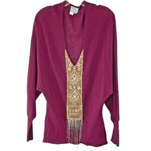 Tracy Reese 100% Wool V Neck Burgundy Knit Beaded Rhinestone Sweater Large