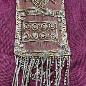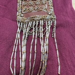 - The front is adorned with beads and rhinestones.