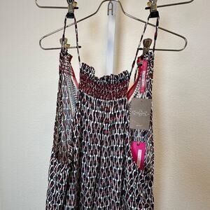 silk dress, Tracy Reese, Anthro dress, geometric, cotton dress, summer wear, smocked dress, midi dress, women's fashion, adjustable straps, red black dress, casual dress, new with tags