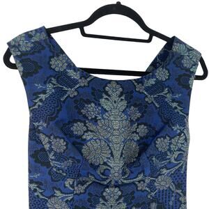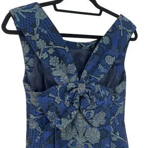 • Features: Sleeveless, Invisible side zip closure, Mini above knee length, Lined, Shift style dress, Bow back accent, Blue with metallic jacquard floral print, Royal blue metallic jacquard (55% polyester, 41% cotton and 4% metal fiber), Charmed By You style dress by Tracy Reese