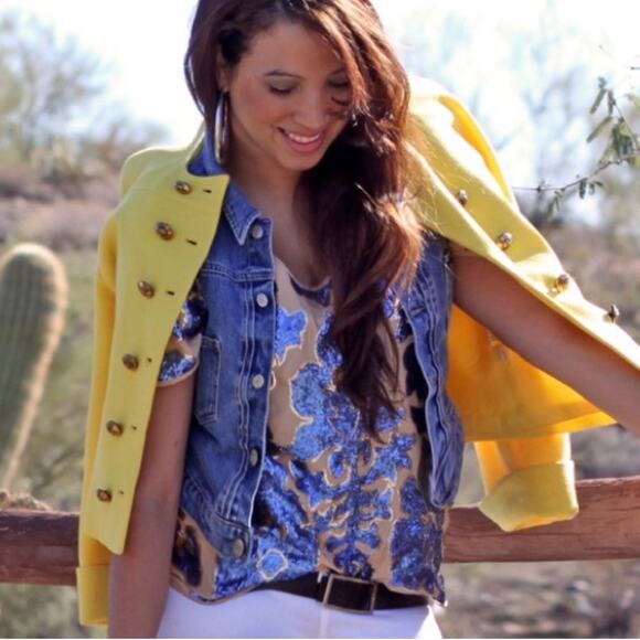 Glamorous royal blue and nude sequin top. Lined in front, semi-sheer in back. Relaxed fit. No stretch. Scoop neck. A collab with Target and Neiman Marcus. Perfect shell that can go from work to a party. Glam, regency, maximalist vibes