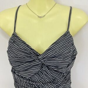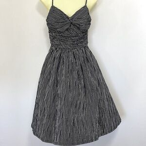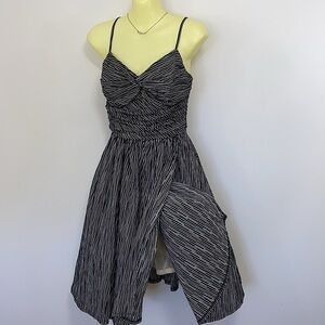 BY TRACY REESE HERE IS A FABULOUS SUN DRESS FOR SPRING AND SUMMER. IT IS DONE IN COTTON WITH NYLON LINING AND SPANDEX FOR STRETCH. THIS LOVELY DRESS FEATURES GREY AND WHITE STRIPES. IT HAS ADJUSTABLE LINGERIE STRAPS AND A GATHERED WAIST AND BUST. FIT AND FLARE STYLE, THERE IS A DEEP 28” SLIT IN FRONT. KNEE LENGTH~ BACK ZIP. NWOT~SIZE 10, PLEASE NOTE THE MEASUREMENTS