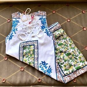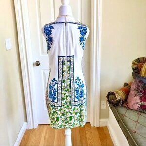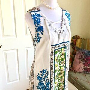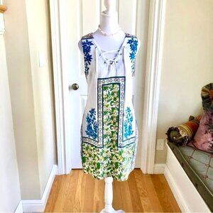 Beautiful sleeveless textured cotton dress in white yellow blue green multi colored, sheath style, European tomato girl print, front ties, Plenty by Tract Reese, Euro Summer