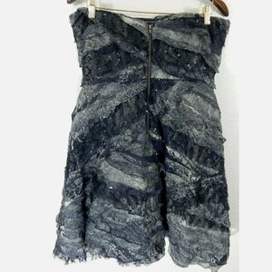 Item: Women's Black Beige Lace Print Sequin Tiered Ruffle Strapless Mini Dress