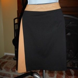 Elegant and Trendy A-line skirt by Tracy Reese. Features tan leather waist band, a bold two-tone color block design with a stylish side zipper. Ideal for versatile wear.