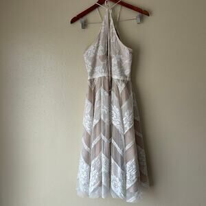 Coquette and preppy Tracy Reese white lace knee length dress in a size 8. This dress has a high halter neck with a back keyhole detail, it has lace fabric overlaying a nude lining, a waist tie, and a back zipper closure. This dress is perfect for events.