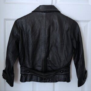 Stunning Tracy Reese leather jacket with lots of details: contrasting stitching, pockets, silk floral lining, and large rounded buttons. In excellent preloved condition. Size 2, runs a little small. Semi-cropped length.