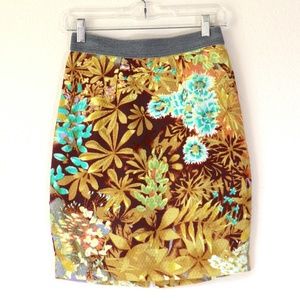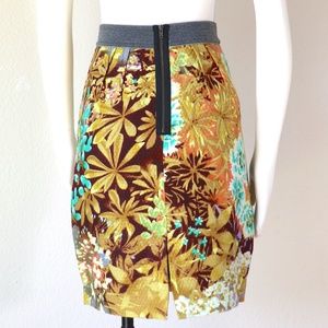 Tracy Reese mini skirt in a quilted tropical print in yellows/browns/greens/grey, fully lined