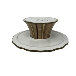 Good condition. Preowned. Clean. Smoke-free environment. Has small nicks on the rim. Burgundy with Olive green and tan.