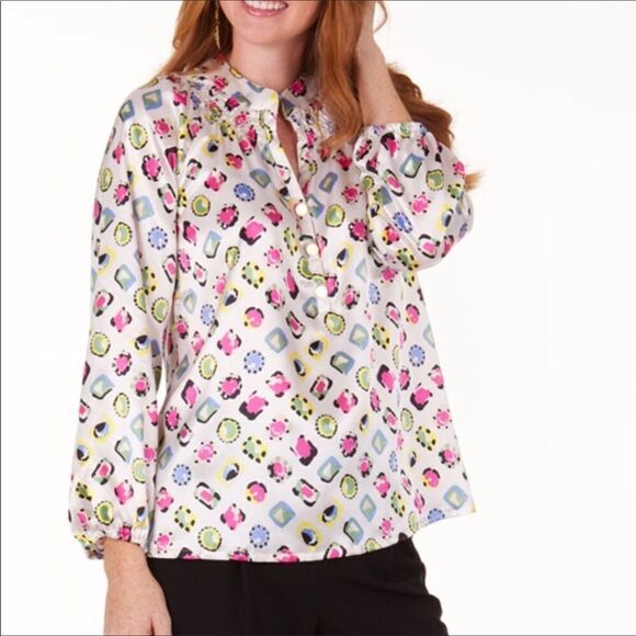 Tracy Negoshian Kira jewels print top. This effortless, smocked neckline Top could be worn in a professional setting or dressed down for a more casual setting.