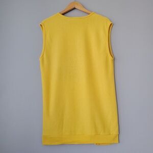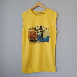 Vintage yellow beach surfing sleeveless crewneck muscle shirt from Trade Winds. Light sweatshirt material. Longer length. Wear to the inside tag as shown.