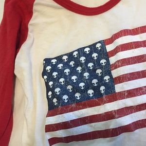 Has cute little aliens instead of stars, quarter length sleeves, the flag looks worn but that's how it came from the store, cropped.