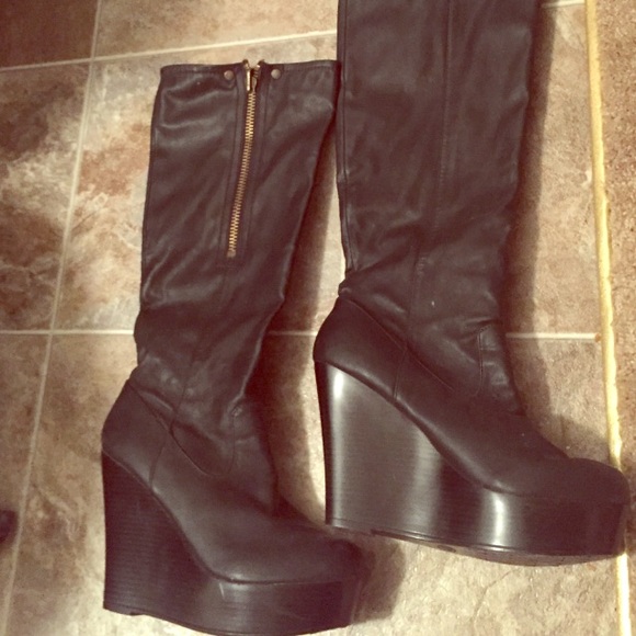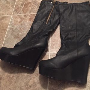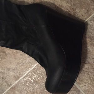 Candie's size 8.5 black platform boot. They go up to the knees on me & have a zipper on the inside of the leg. The heel is about 4.5 inches, but there is also about an 1.5-2 inches of heel on the toe area as well. Really easy to walk in. Only worn a few times. In great condition. Perfect for a night out.