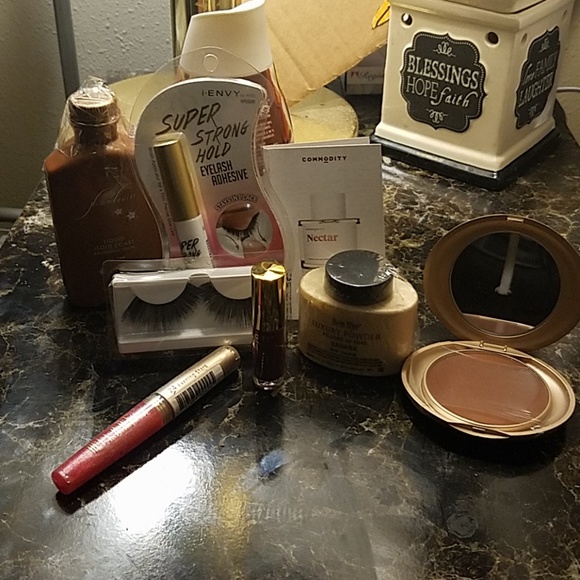 Brand new makeup set this is all brand new makeup all completely sealed it even comes with Liquid Gold Coast bronze and glow this is the only bronzer I will ever use and it cost $30 a bottle alone it is 4oz but will last you a long time it will also come with Ben Nye banana luxury powder it will also come with a tarte lip gloss which is a beautiful color it will also come with a brand new clear super strong hold eyelash glue name brand with a pair of eyelashes to go with it also and more๐๐๐