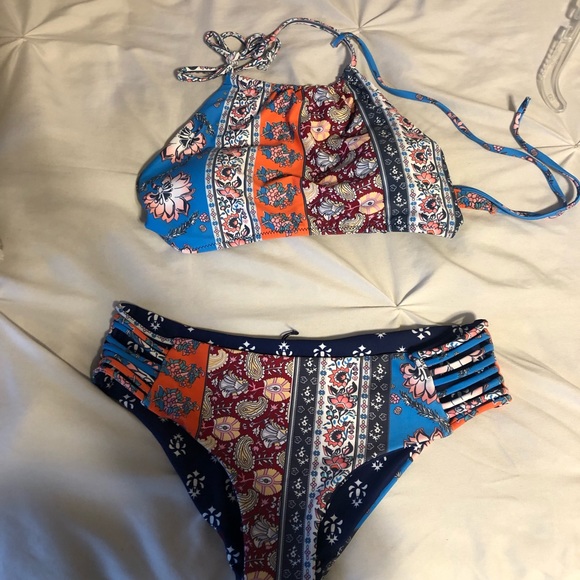 Unworn bikini, tags have been removed. The top ties and is a high neck halter, the bottoms are hipster. The bikini can be reversed if chose to do so, however not specifically designed to do so. Super nice and thick material.