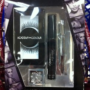 Eyelashes, jewels, mascara, tweezers, stick for applying jewels. From sears.