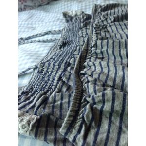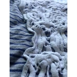 Grey and blue stripped spagetti top, has a beautiful crochet design in the center . has been used but it isn't faded or has stains or rips. Feel free to ask any questions.