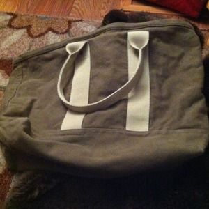 Khaki green, cortton/cloth material, medium to large size. Never used it. Great for traveling or take to the beach.