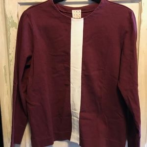 Burgundy 100% cotton Trademark shirt with cream vertical stripe sewn on top. This is from a few years ago, when Trademark made a lot more clothing in addition to shoes and bags. The stripe is almost like a heavy grosgrain ribbon, and it's on the front and back of the shirt (as shown). The shirt itself is thick cotton, and it's in good condition -- has been washed a few times, but there's still lots of life left in it. Size small.
