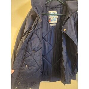 Stay warm and stylish with this Trader Bay vintage navy jacket. The jacket features a zip closure, quilted accents, and an elastic waist for a comfortable fit. The softshell fabric type and breathable lining material make it suitable for winter, fall, and spring seasons.